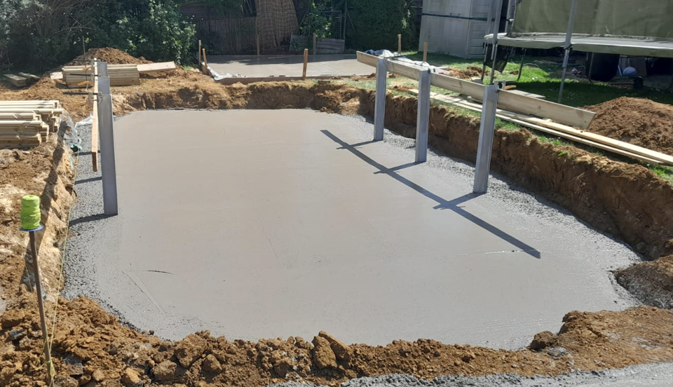 - La chape en béton de 20 centimètres et placement des arceaux métalliques